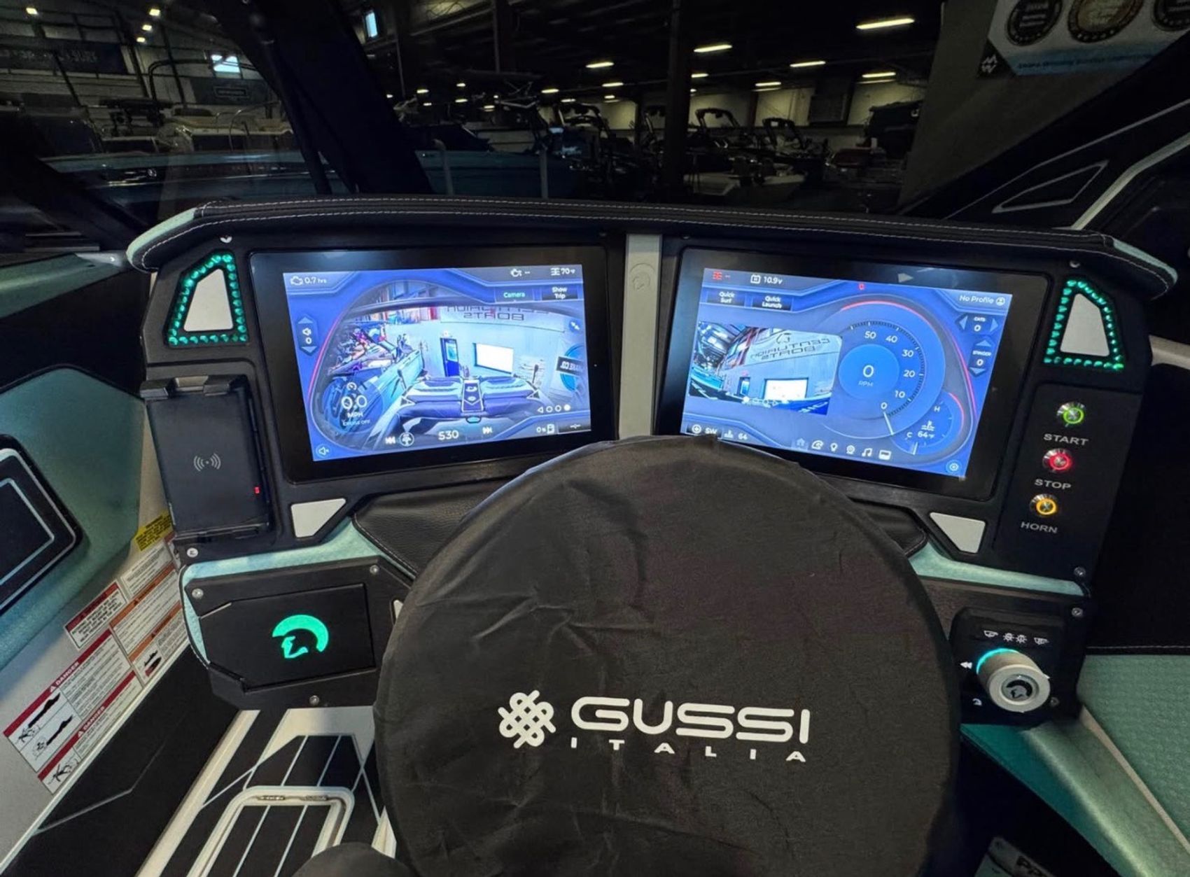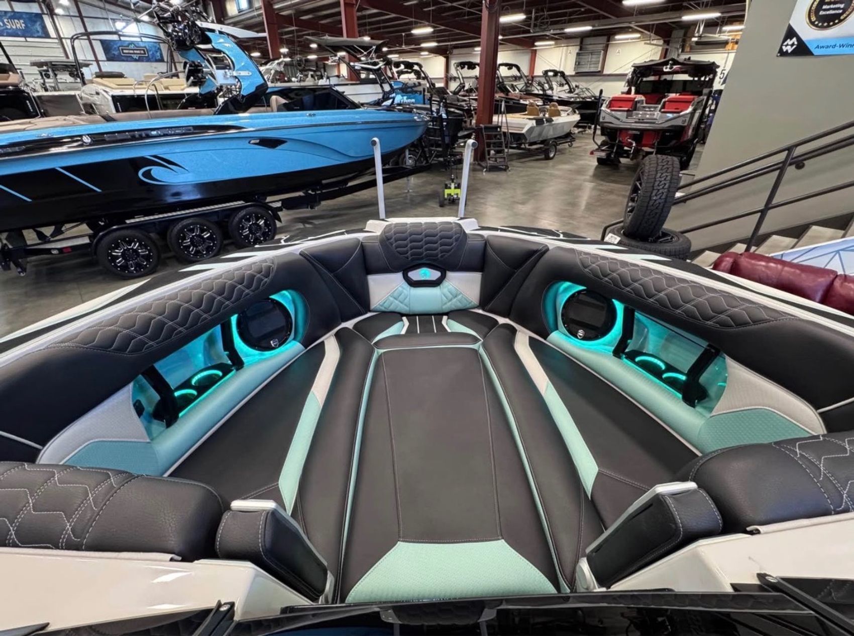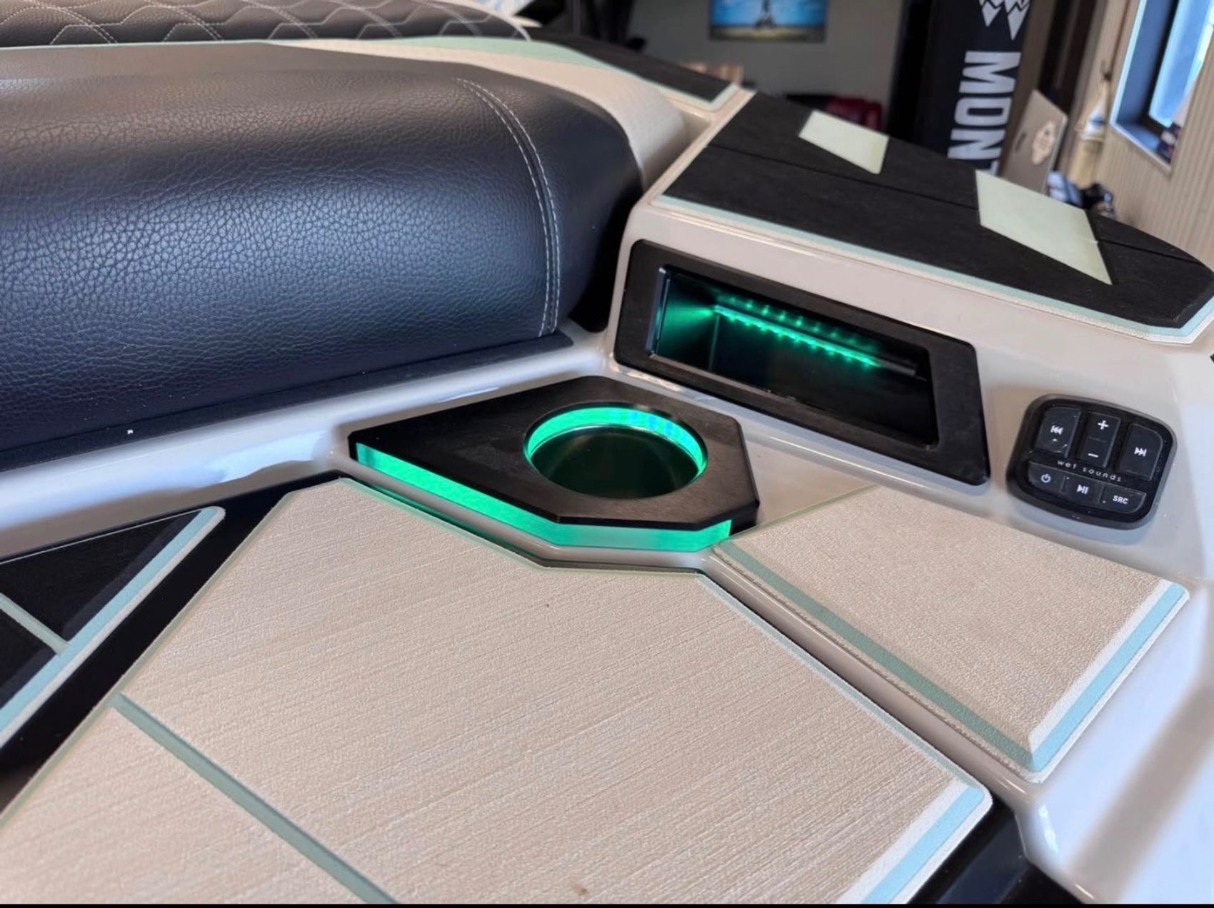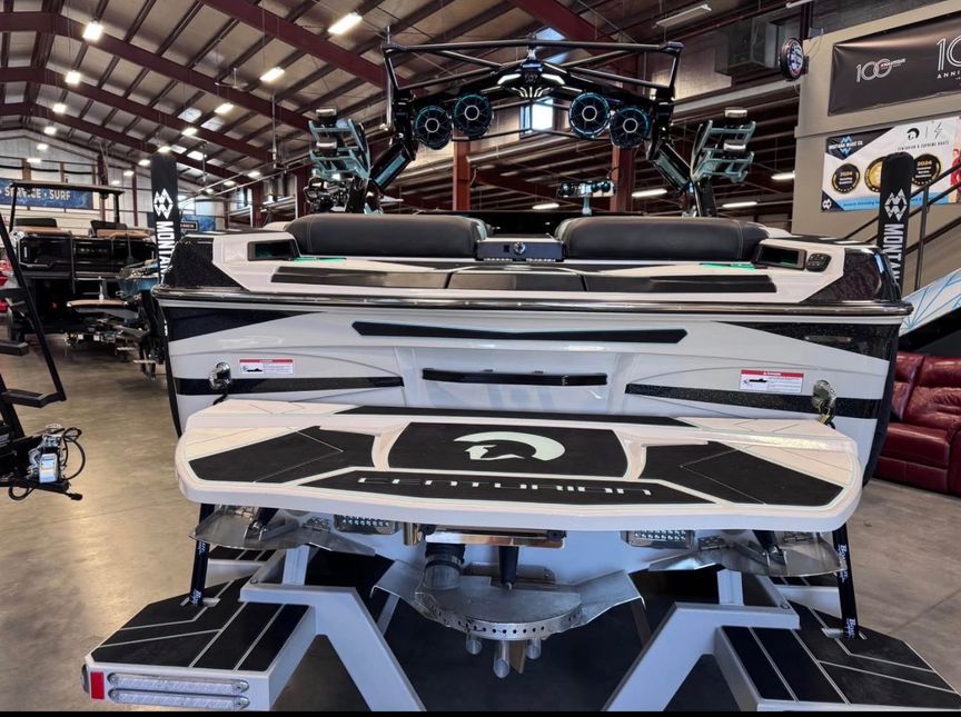 The sound system is next level with the Wet Sounds Warriors Quad system, including 4 tower horns, interior speakers, dual 12” subs, and a transom remote. Rides on an upgraded Boatmate tandem axle trailer with 18” FUEL wheels, spare, runway lights, GatorStep tread, and boarding ladder.