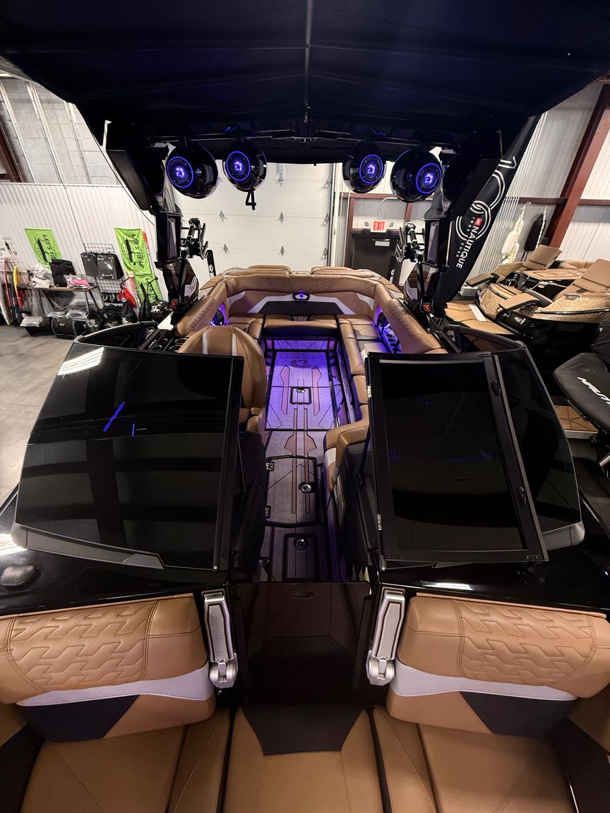 Additional highlights include Bombshell 2.0 colored strapless board racks, RGBW interior lighting, underwater RGBW-capable LED lights delivering 20,000 lumens, a 6-way power seat adjuster, bow armrests, and Navionics US & Canada GPS mapping.