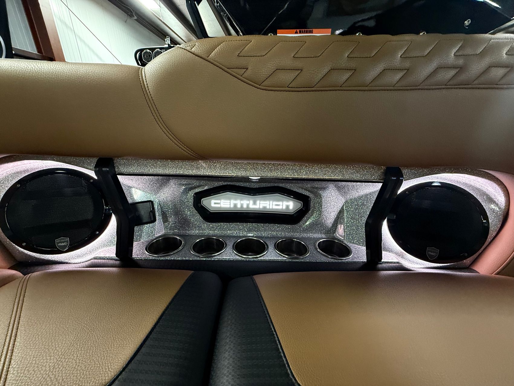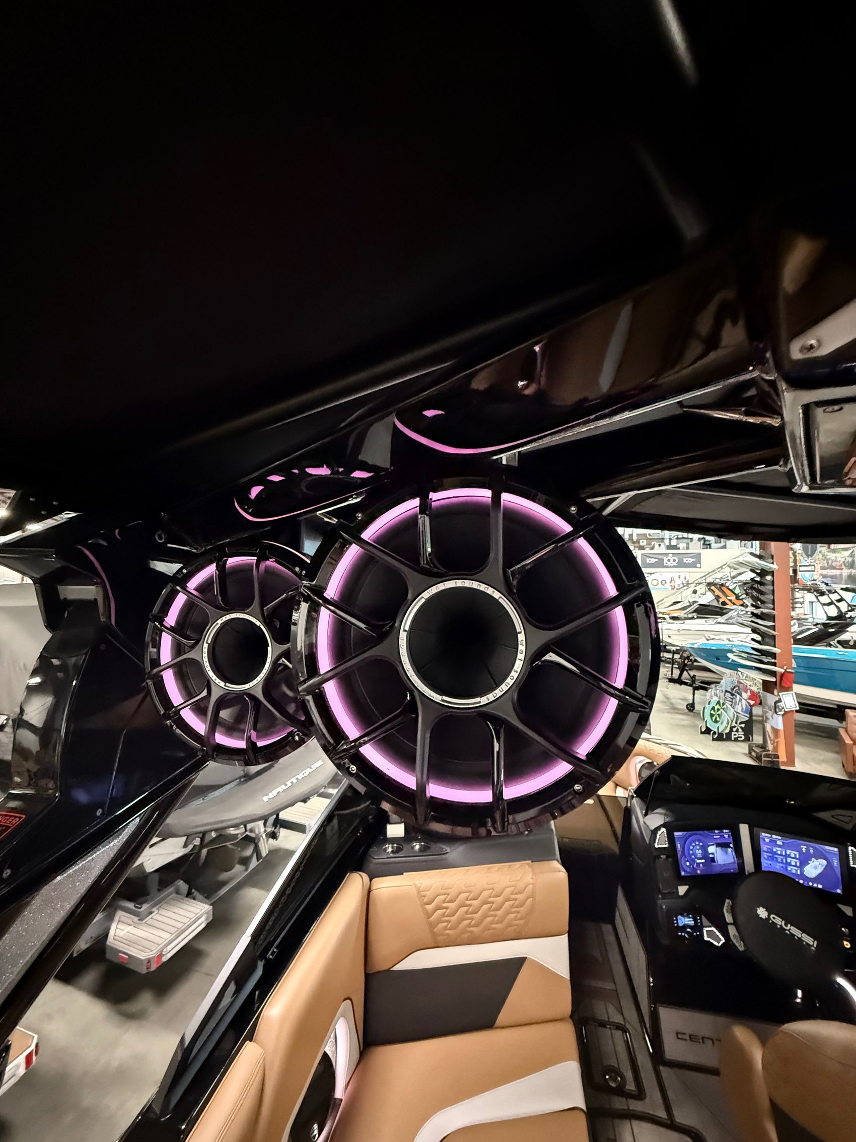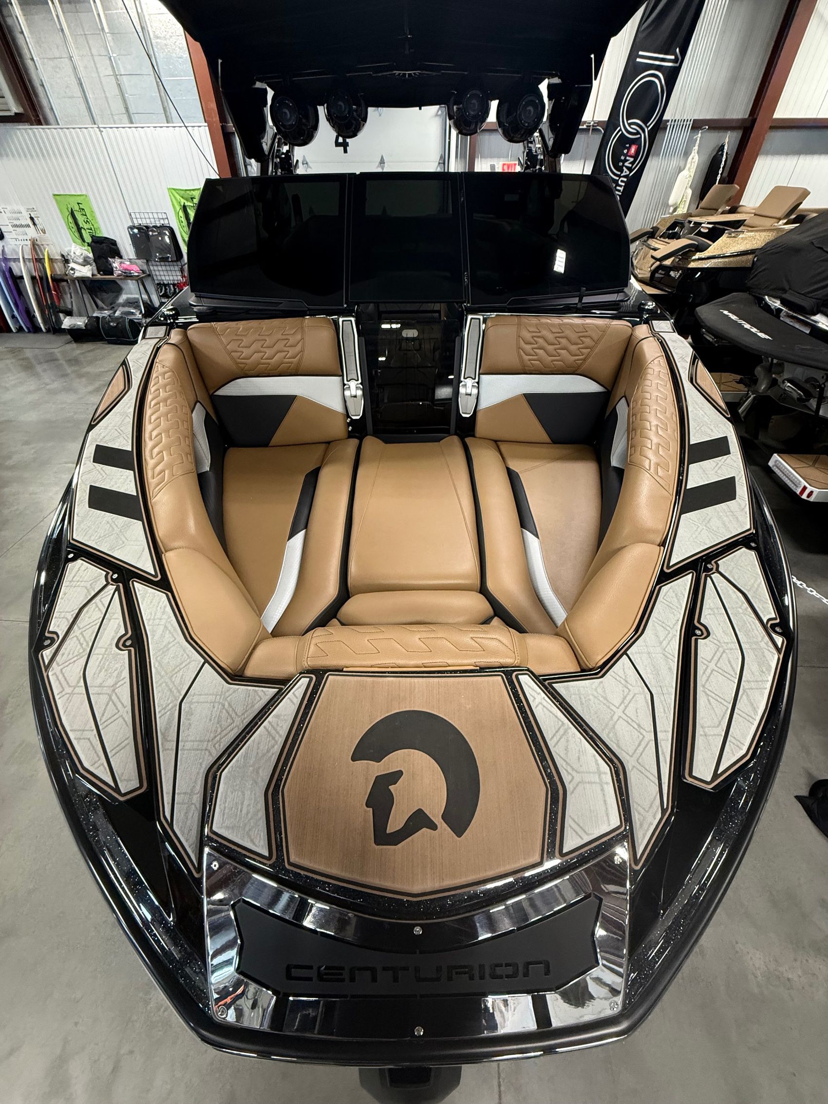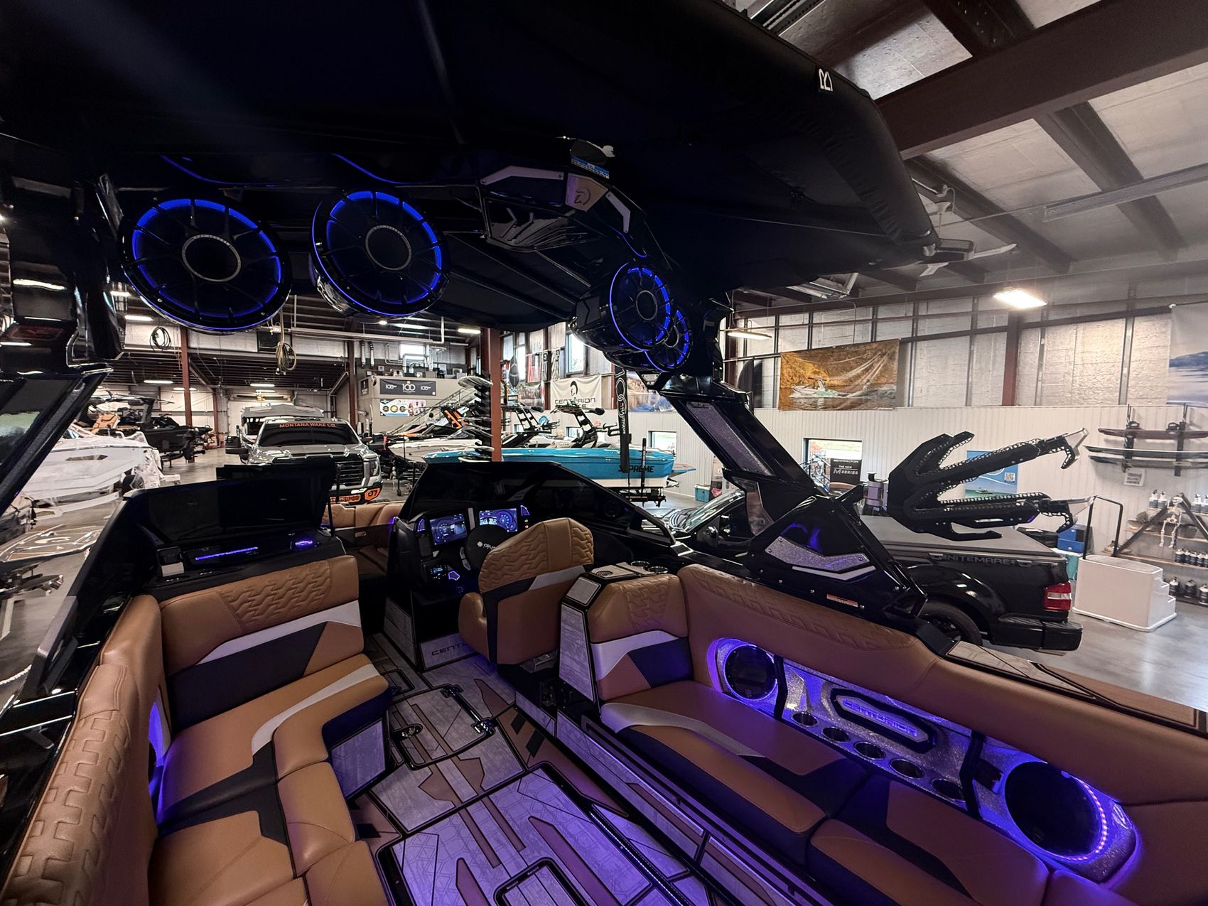 The sound system is the Centurion 12 Warriors System by Wet Sounds, including four 12” REV HD horns on the Predator Power Tower, 8” HLCD interior speakers, and a 12” REVO XXXV4B subwoofer, all controlled seamlessly through on-screen controls. A second subwoofer and transom remote enhance the listening experience further.